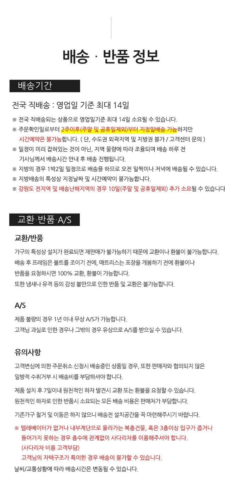 • * 엘리베이터가 없거나 내부계단으로 올라가는 복층건물, 혹은 3층이상 입구가 좁거나 들어가지 못하는 경우 층수에 관계없이 사다리차를 이용해주셔야 합니다. 사다리차 : 8~15만원 고객님부담 / 양중비용 : 5~10만원양중비용 5~10만원